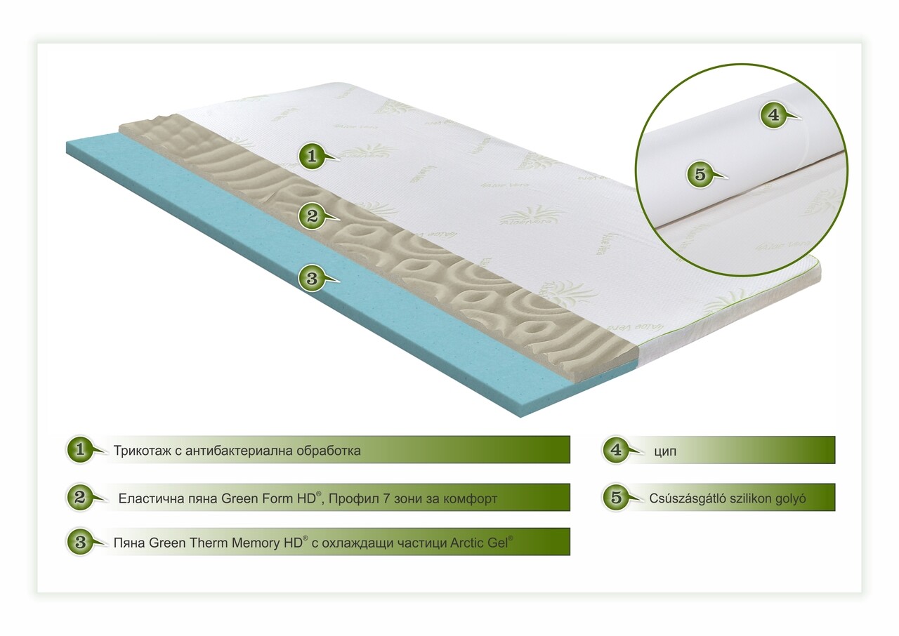 Структурата на топера се състои от два слоя полиуретанова пяна: слой еластична пяна Green Form HD® с отворена клетка и профилиране 7 комфортни зони< /strong> и слой от пяна Green Therm Memory със студен гел от арктически частици®, който предотвратява прегряването по време на сън и оформя тялото, премахвайки точките на натиск по време на сън, за да отпусне мускулите и осигурява правилно кръвообращение.