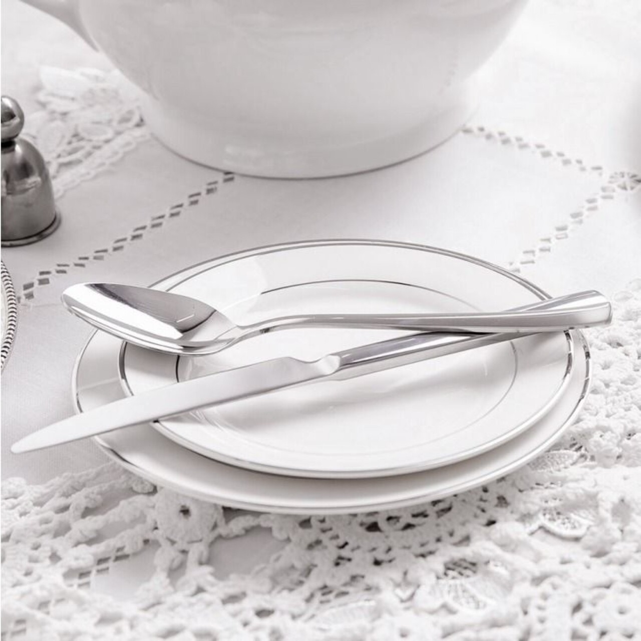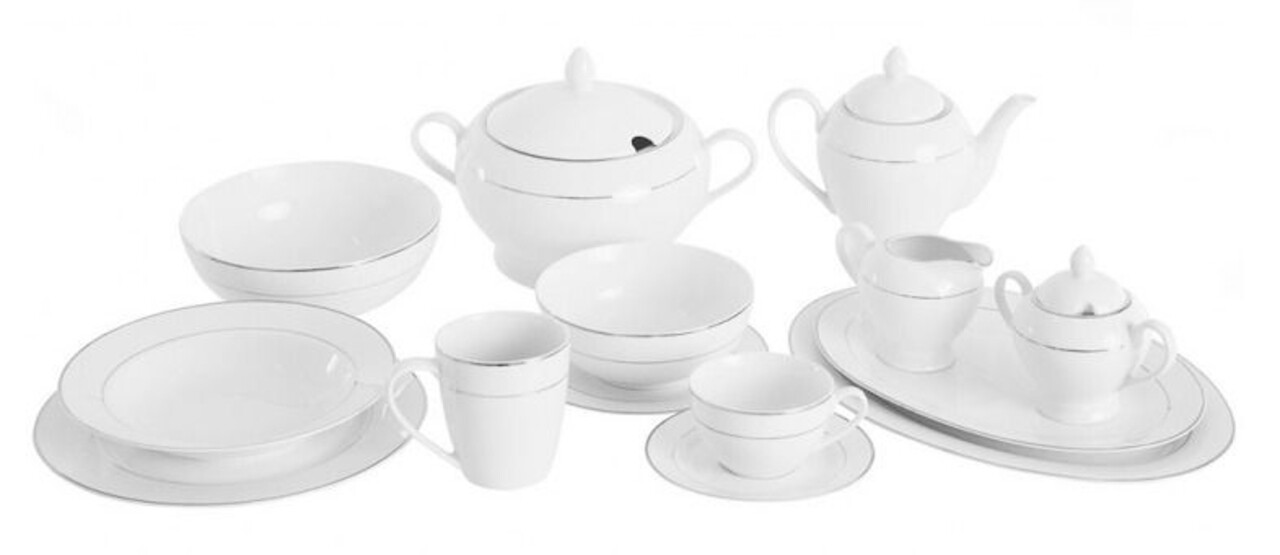 Изключително елегантна порцеланова линия, украсена с нежни сребристи линии. Класическата форма и фината декорация го правят идеален както за традиционен, така и за модерен интериор. Висококачественият New Bone China порцелан, със сиво-бял нюанс, е издръжлив и изглежда много изключителен.