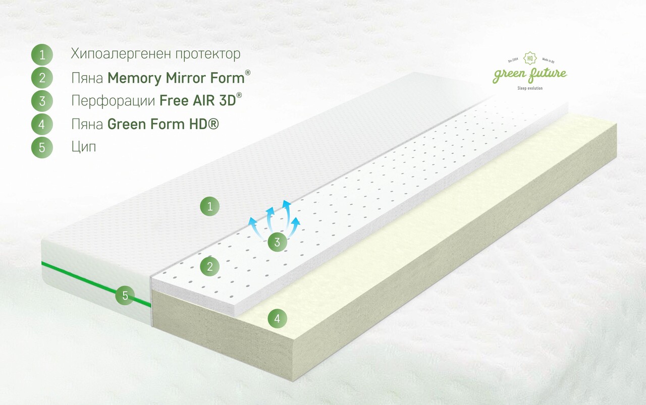 Изработен от висококачествени материали, структурата на матрака се състои от слой от 14 смеластична полиуретанова пяна Green Form HD® ; което осигурява естествена позиция на гръбначния стълб по време на сън и обилен слой пяна 3 см пяна Memory Mirror Form® с ролята на облекчаване на точките на натиск (рамене, бедра и крака) за осигуряване на пълно отпускане на мускулите по време на сън.