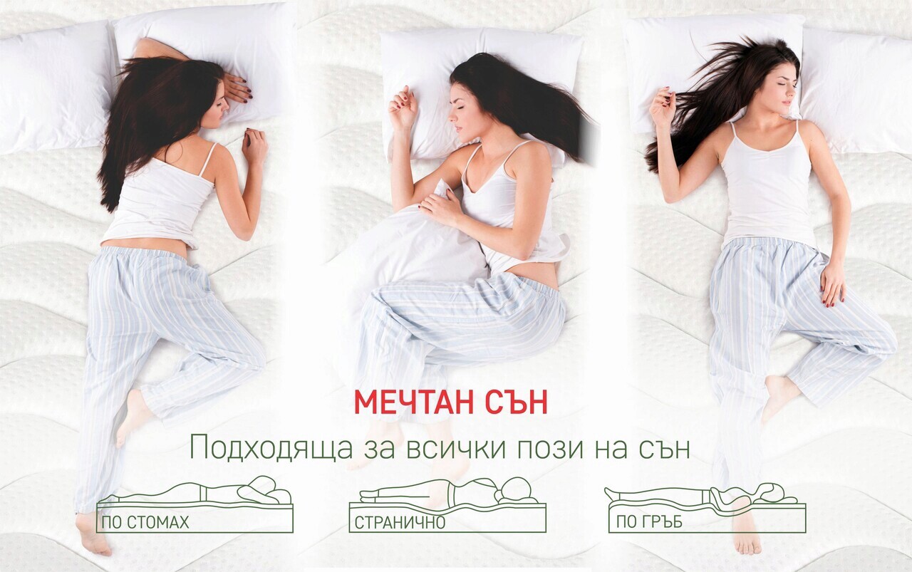Двоен комфорт. Препоръчва се за всички пози на сън. Матракът може да се използва от двете страни, както тази с Memory слой, така и по-твърдата страна със синтетични влакна.