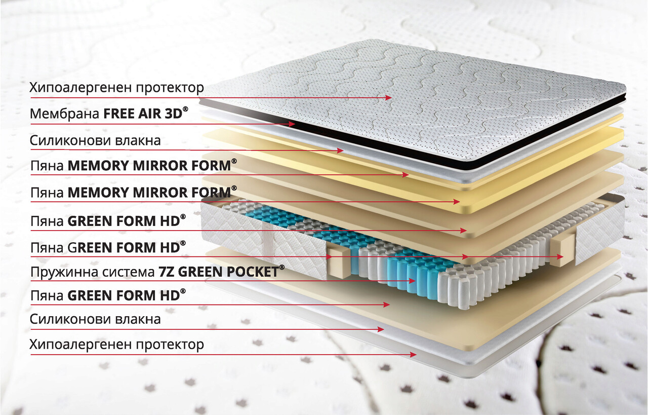 Усъвършенствана технологична система от 7Z Green Pocket® пружинира заедно с тази на слоя Green Therm Memory® осигурява сън без размножаване на движенията на партньора.