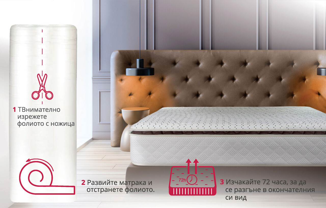 • внимателно разгънете защитното фолио, без да използвате нож или други остри предмети, които могат да повредят тъканта на матрака.