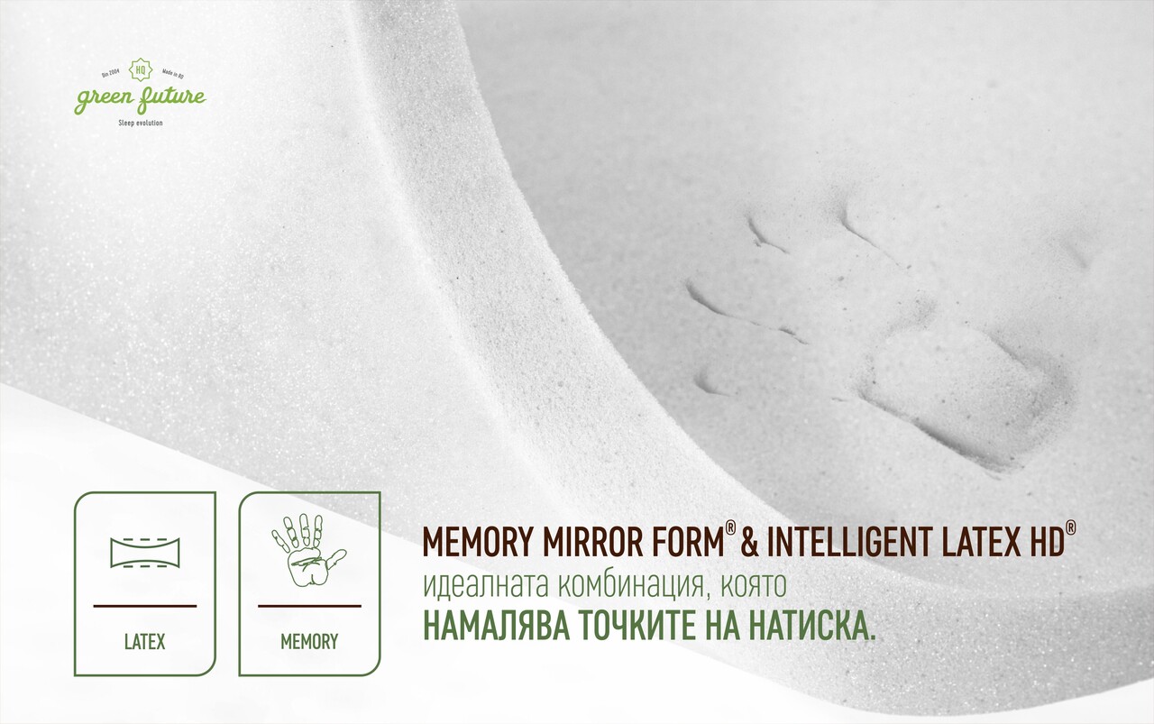3-сантиметровият слой мемори пяна Mirror Mirror Form® се оформя перфектно по контурите на тялото, като осигурява равномерно разпределение на теглото и персонализирана опора. Освен това, благодарение на иновативната си конструкция, Intelligent Latex HD® осигурява отлична дишаемост и подобрена термична стабилност, като поддържа комфортна температура през цялата година. Еластичността на латекса го прави недеформируем материал, който е изключително издръжлив в дългосрочен план.