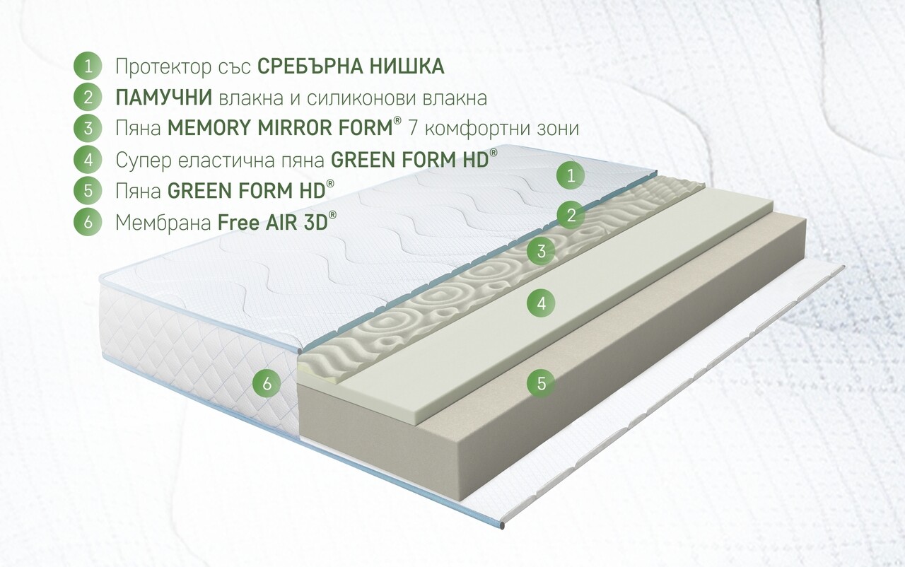 - 3 см супер еластична пяна Зелена форма HD® който играе ролята на междинен слой от мини пружини между опорната основа на тялото и мемори. Има ролята да подобри опората на тялото в лумбалната, цервикалната и коленната област.
