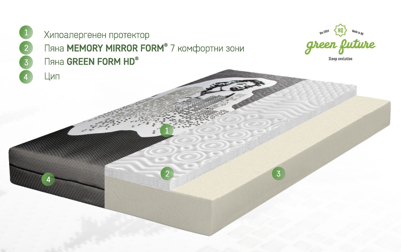 Комфортната зона на матрака се състои от обилен слой мемори пяна Mirror Foam® от 5 см, профилиран в 7 зони на комфорт, който реагира на телесната топлина и се оформя спрямо нея, елиминира точките на натиск по време на сън, за да отпусне мускулите и да осигури здравословно кръвообращение.