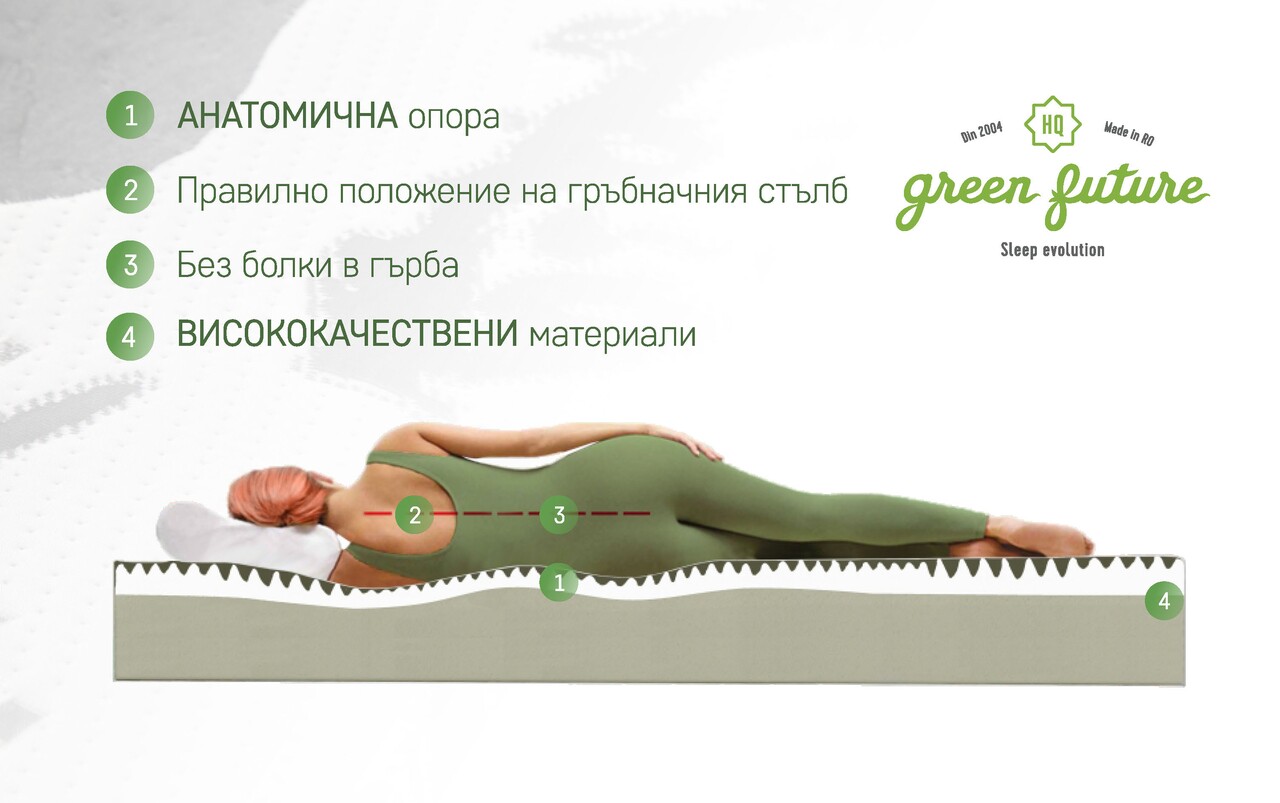 Основата на матрака от еластична пяна Green Form HD® с отворени клетки осигурява анатомична опора на тялото и правилна позиция на гръбначния стълб без болки в гърба по време на сън.