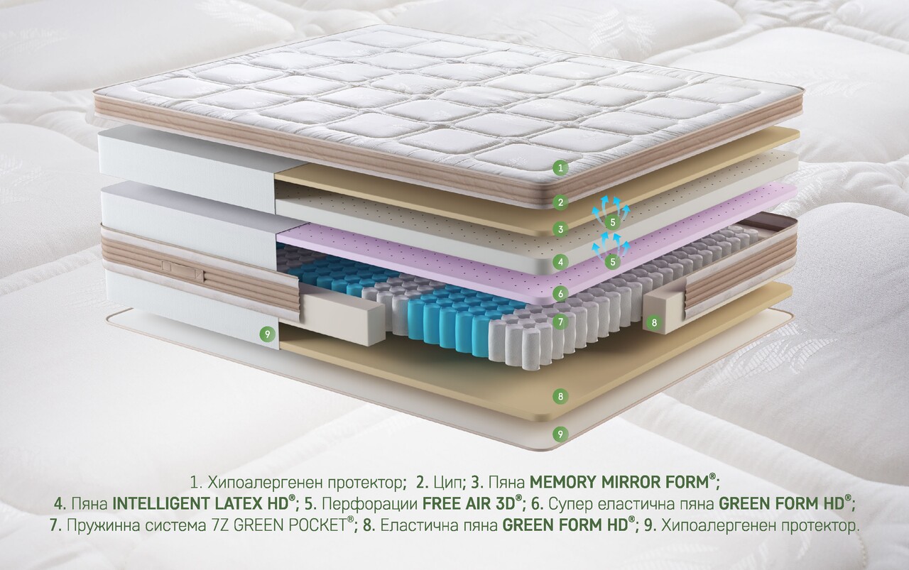 Система 7Z Green Pocket® е завършен от еластична пяна Зелена форма HD® с отворена клетка и супер еластична пяна Green Form HD® който има способността да възвръща първоначалната си форма много бързо, като по този начин предлага същия комфорт дори след години на употреба. С ортопедични свойства, супер еластична пяна Green Form HD® осигурява естествена и правилна позиция по време на сън, като по този начин предотвратява болка в гърба или шийката на матката.