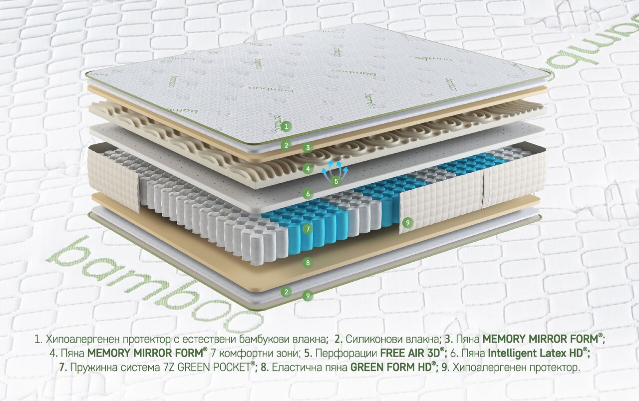 Матракът Премиум бамбуков мемори латекс, изработен от висококачествени материали, идеално съчетава пружинна технология индивидуално опаковани 7Z зелен джоб®, еластична пяна Green Form HD®, пяна Интелигентен латекс HD® и пяна Memory Mirror Foam за отличен ортопедичен и анатомичен комфорт.