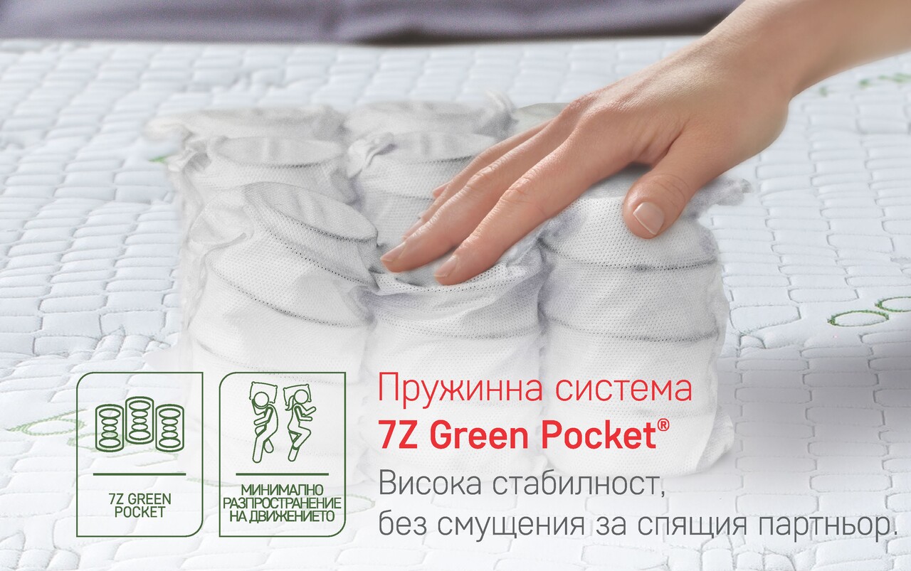 Плюс системата 7Z Green Pocket® позволява различна опора на частите на тялото в зависимост от натиска, който упражняват върху повърхността на матрака, за да се осигури подравняване правилни и здрави на гръбначните прешлени.