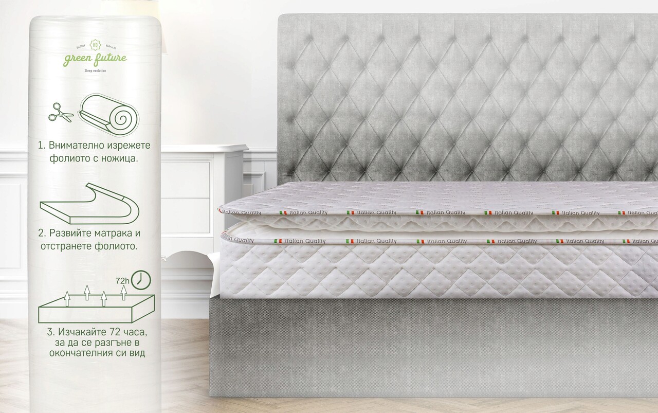 Матракът е вакуумиран и навит. Прочетете внимателно инструкциите за работа и разопаковане.