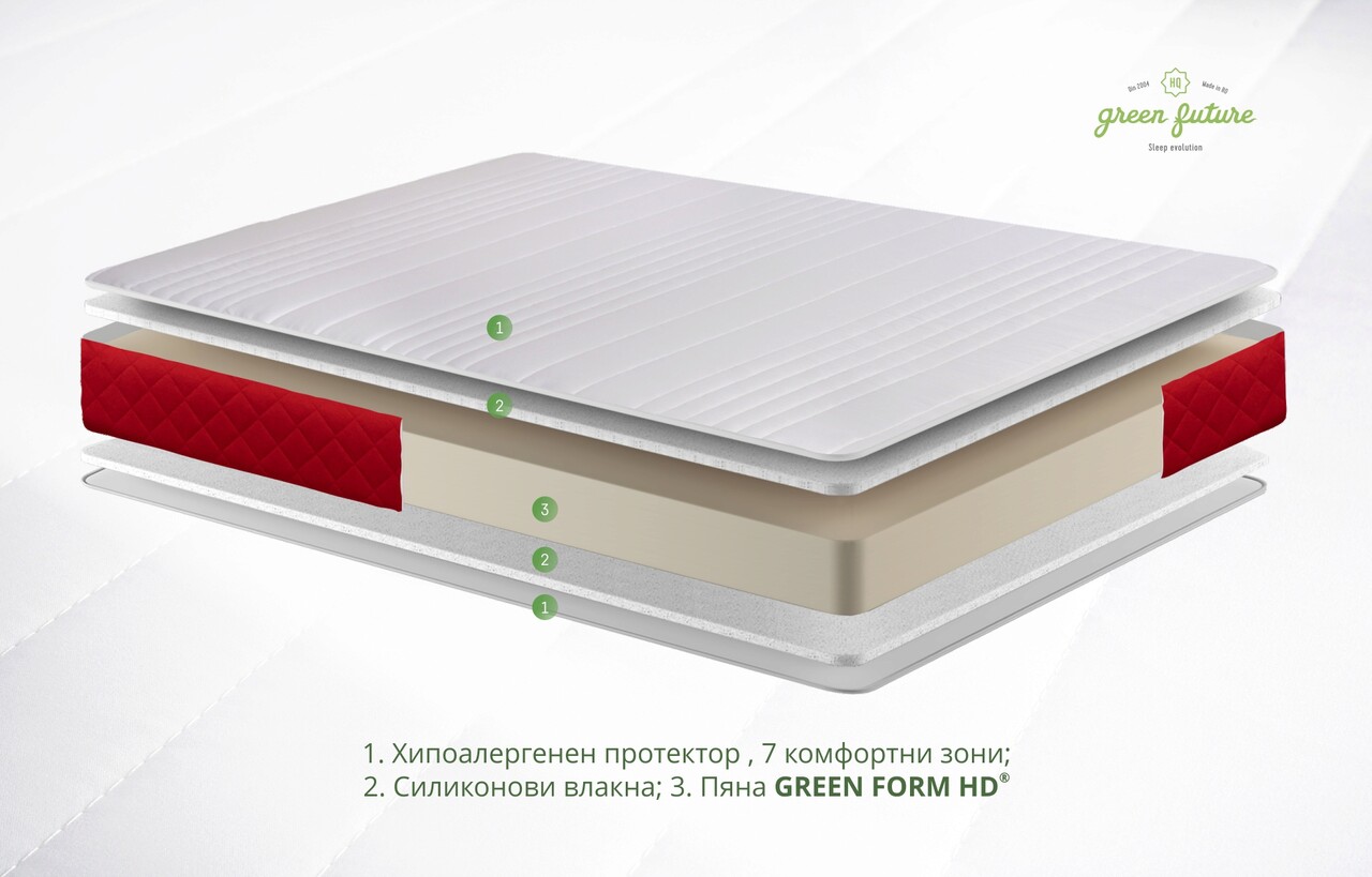 Матракът е разработен от материали с най-високо качество. Основата на матрака, изработена от еластична пяна Green Form HD® с отворена клетъчност, осигурява анатомична опора на тялото и правилна позиция на гръбначния стълб без болки в гърба по време на сън.