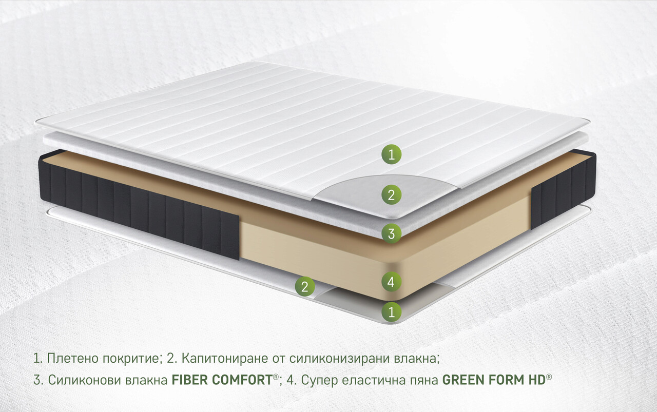 Щедрият слой от еластична пяна Green Form HD® с отворена целула идва в допълнение към слоя FIBER COMFORT ®, осигуряваща анатомична опора на тялото и правилна позиция на гръбначния стълб, без болка назад по време на сън.