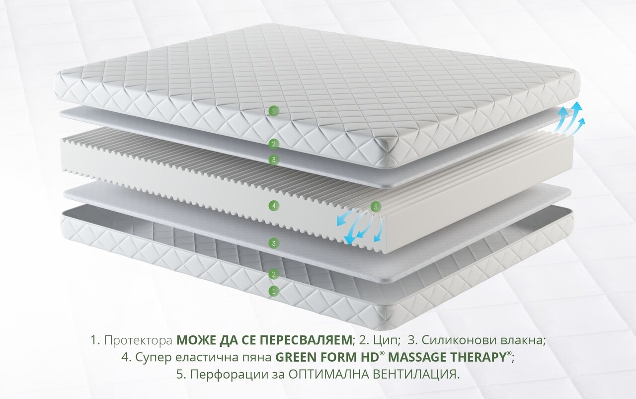 < strong>Еластична пяна Green Form HD® Massage Therapy®, с превъзходно качество, е специално проектиран да поддържа тегло до 140 кг, като същевременно поддържа тялото в правилна позиция по време на сън.