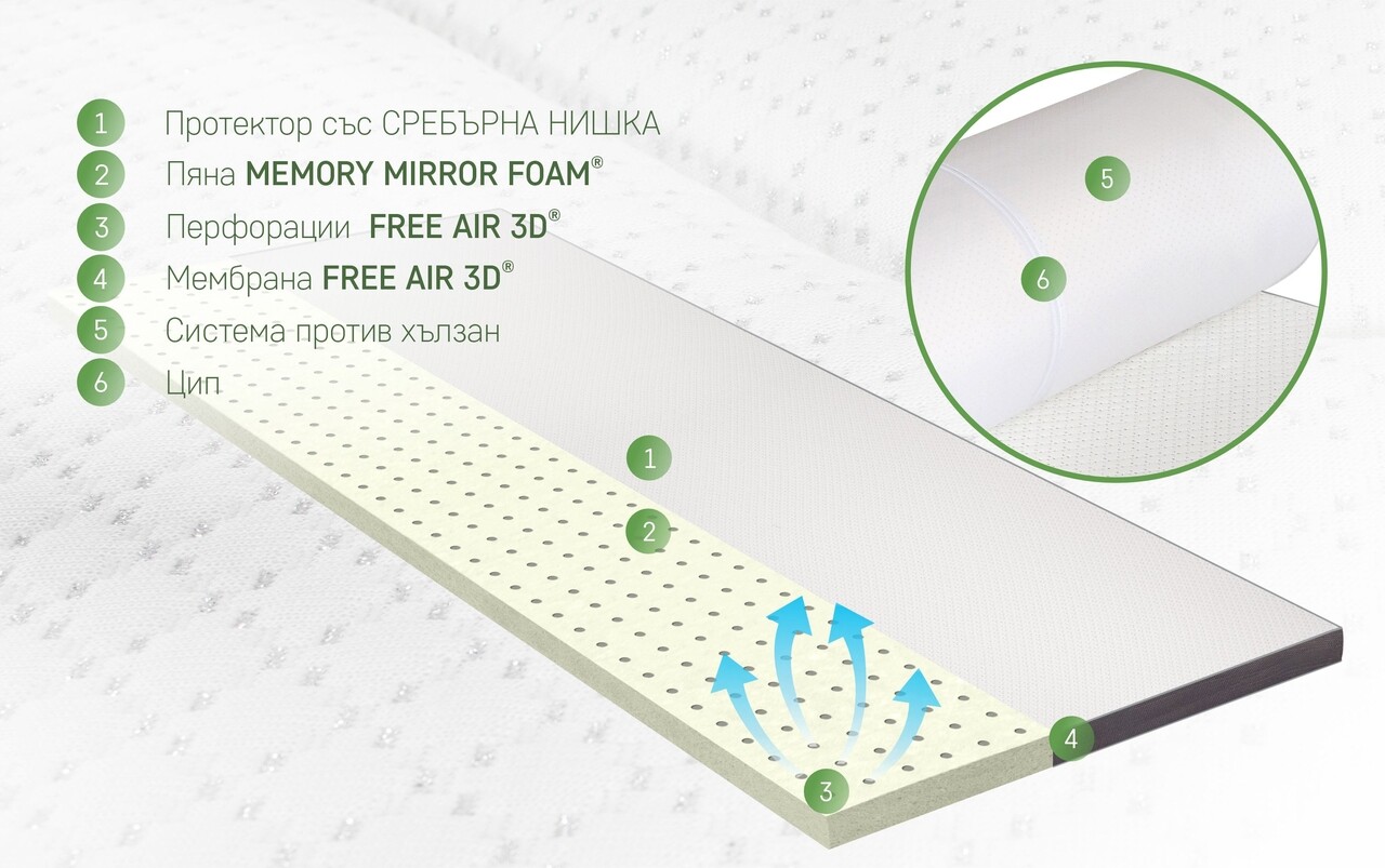 - полиуретанова пяна < span style= "color: #222222;">Memory Mirror Foam® с перфорации Free Air H = 8 cm